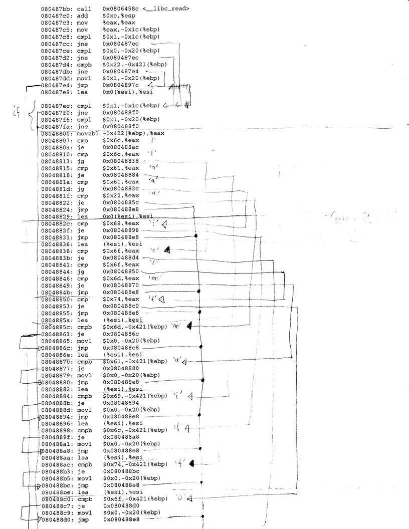 With this in mind I wrote a small C program, dump.c[2], that processes the Snort log and prints out the commands sent to the backdoor as well as its responses. I ran this program on the provided Snort log and used the program output in the first step of my analysis. The program output is too large to be included here, but I am including it in Appendix A.