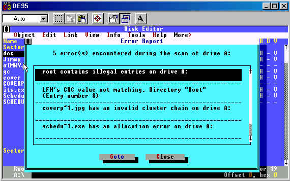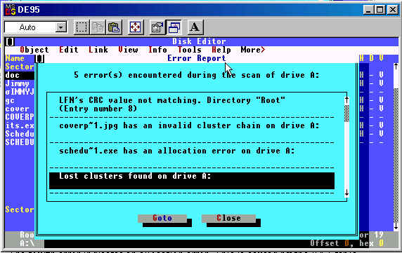 The Diskedit program revealed 5 errors on the disk when first opened. Once again, here is the list: