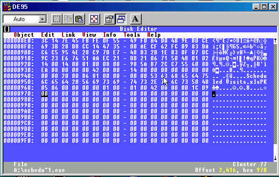 The last file on the disk is the file “Scheduled Visits.exe” This file showed an allocation error when the disk was scanned in Diskedit. Moving to the start of the file data, it is first observed that the header contains “PK” indicating that the file is a zip file. If the file is copied from the disk as is, and renamed to Scheduled Visits.zip, it cannot be opened, and returns an error. It is known that he format of PKZip files includes a directory in plain text near the end of the file, which is not present in the first 1000 bytes of this file, the size indicated in the directory entry. Examining the contiguous sectors after the apparent end of file, the zip file contents entry is located at offset 2,378 from the start of the file.